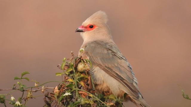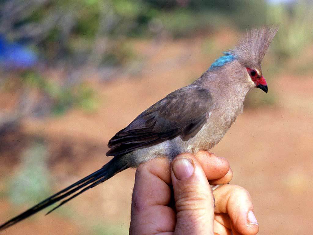 A pale grey mouse bird with a bare red face. Red face and generally paler appearance separate it from Speckled and White - backed mouse birds. Lacks blue nape patch of Blue – naped Mouse bird. In flight, grey rump contrasts with darker back and tail. Flight is direct, fast and powerful; usually more sustained than Colius Mouse birds. Juvenile has yellowish – green face. Habitat (Ecology); Thornveld, open broadleafed woodland and suburban gardens. Status; Common resident. Voice; Clear, whistled “chi vu vu’, first note higher pitched. · Range (Distribution); Southern Africa (South Africa, Namibia, Botswana, Angola, Zambia, Zimbabwe, Mozambique, Malawi, Lesotho, Etiswatini